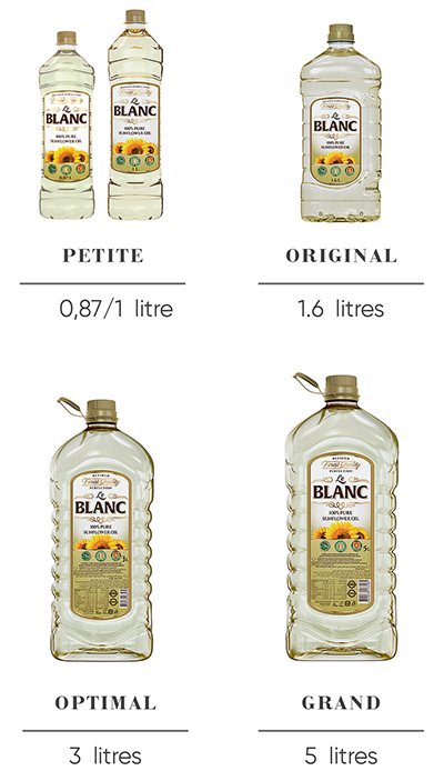 Well-balanced design of Le Blanc bottle is brought to you by our creative team. Convenient, easy to hold silhouette is a classic with a stylish twist. Le Blanc oil is available in bottles of different volumes. It will find its place by the stovetop for smooth cooking or at the table to finish a dish with a dash of sunflower oil.